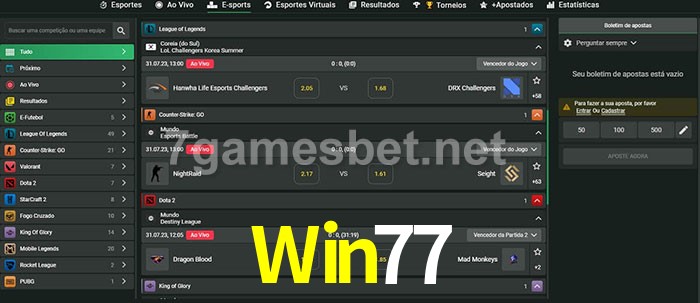 O Win77 oferece uma grande seleção de opções de apostas em e-sports com probabilidades competitivas